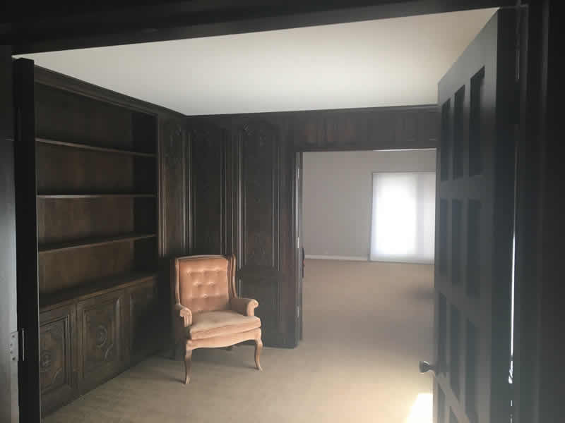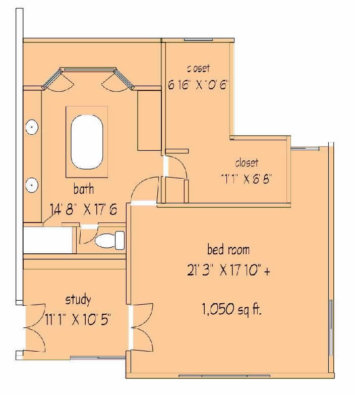 This enormous unit is a two room suite features a dark wood panel library at it's entrance, suitable for an office, parlor, or private library. The bedroom is 21 feet by 17 feet, the opulent bath is 15 feet by 17 feet, and the giant walk-in closet 11 feet by 6 feet. It is approximately 1100 sq ft of space, features vaulted ceilings, lots of windows, and a private garden off of the bathroom.