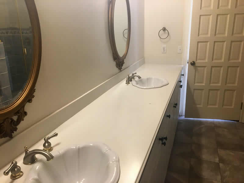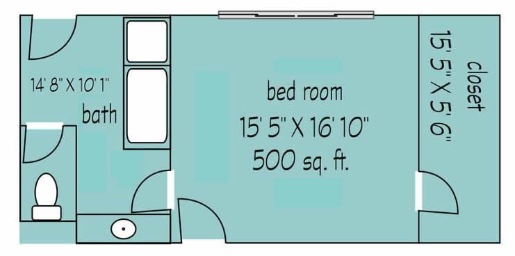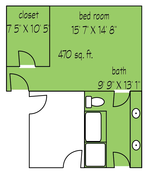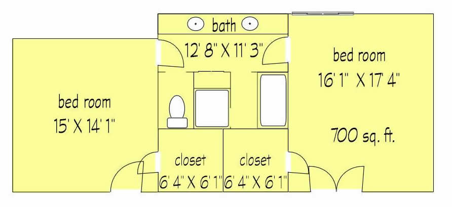 This 2 bedroom suite unit consists of two matching rooms connected by a large bathroom with double sinks, separate tub and shower, and enclosed toilet. Each room has it's own walk-in closet and door to the the main hallway. It is approximately 700 sq ft, and one of the bedrooms features vaulted ceilings.