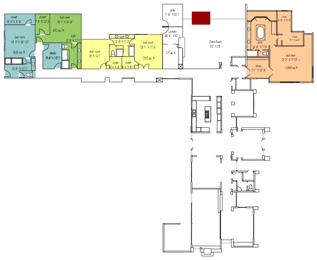 The colored-in areas of the floorplan represent the private suites in the residential wing of the house. Note that there is a hallway in this wing that separates the private suites from the poolside exterior of the house, providing an extra layer of sound protection from the pool area, as well as making the walk to your suite quite nice. Built-in bookcases and large windows line the hallway to the private suites.